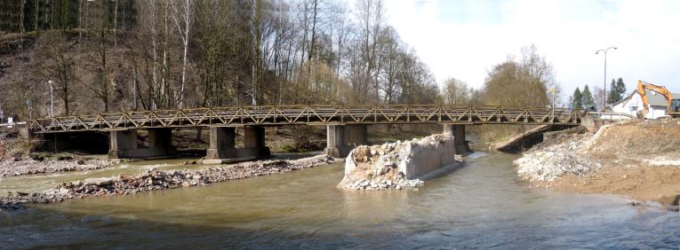 Po odbourání betonu, který most rozšiřoval z důvodu elektrifikace, se objevil nakrátko v plné kráse… aby byl vzápětí zbourán. Zdroj: Z. Hurych